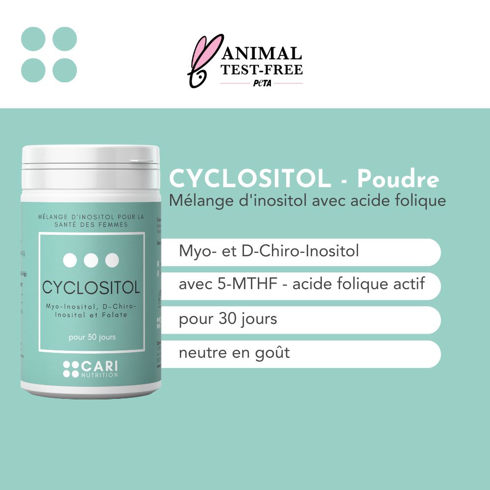 L'inositol, une substance similaire aux vitamines B, peut être produite en petites quantités par le corps à partir du glucose. Il existe neuf formes différentes d'inositol. Cyclositol utilise deux de ces formes essentielles : le Myo-inositol et le D-Chiro-inositol, une combinaison reconnue pour son rôle dans l’équilibre hormonal et métabolique, en particulier pour le SOPK.